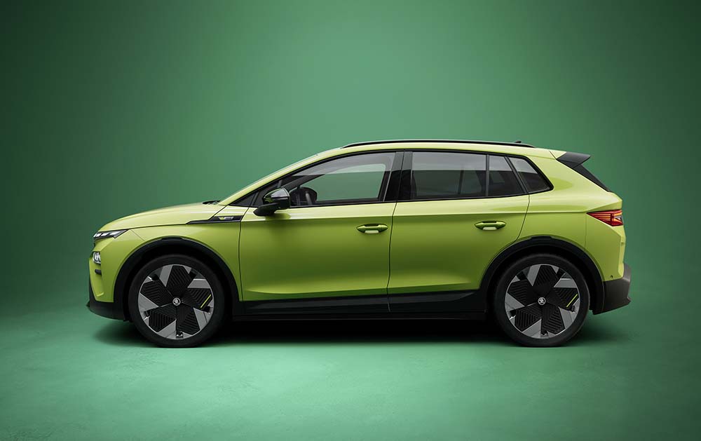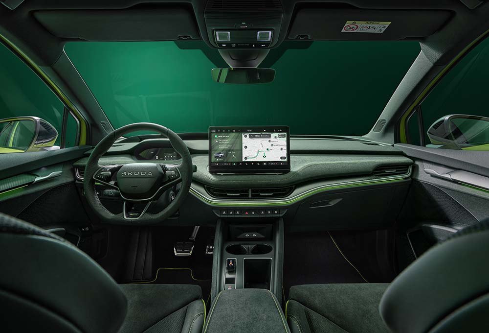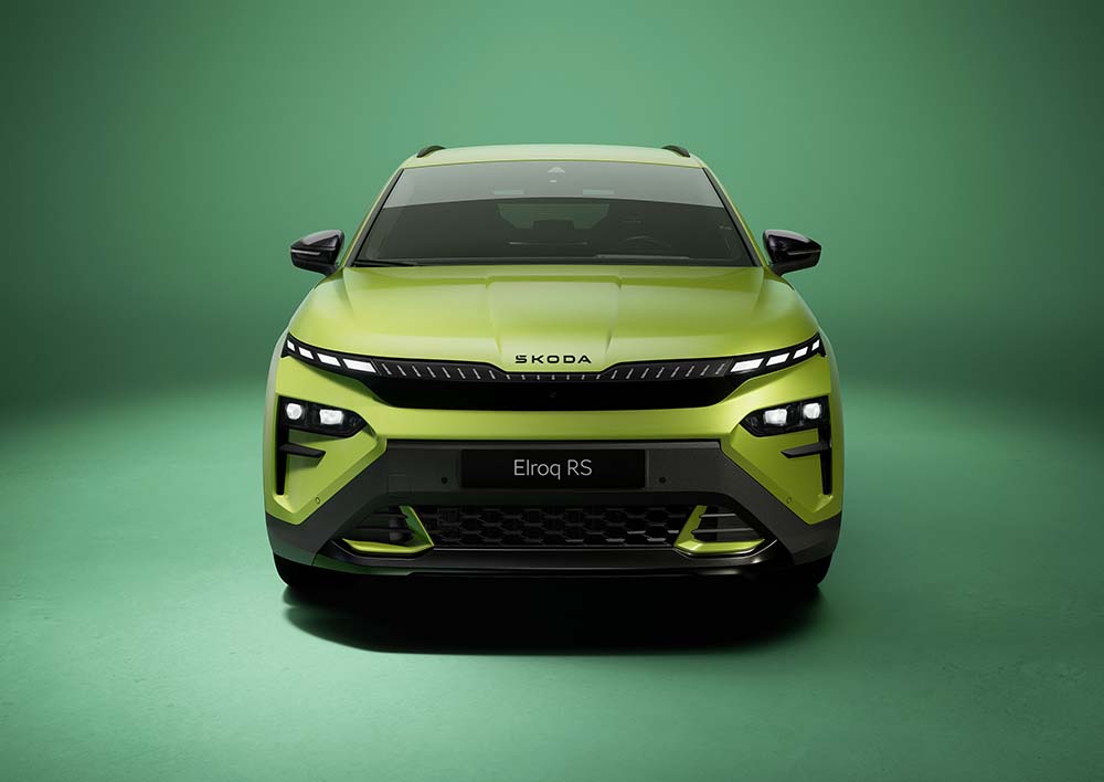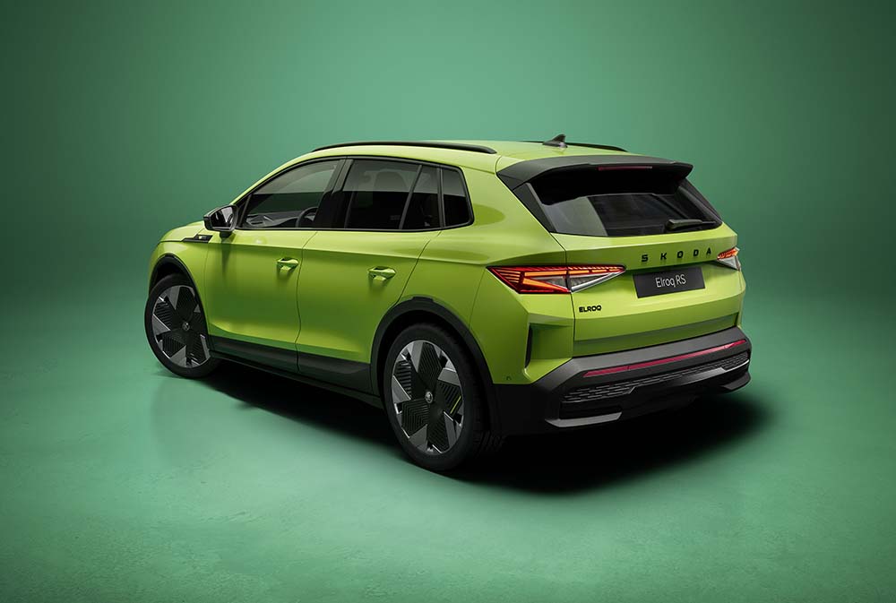 Vizuelno, Elroq vRS dobija diskretno sportsko osveženje: agresivniji “bodykit”, velike aluminijumske felne prečnika do 21 inč i ekskluzivne boje, uključujući na fotografijama prikazanu „hyper green“ zelenu.
