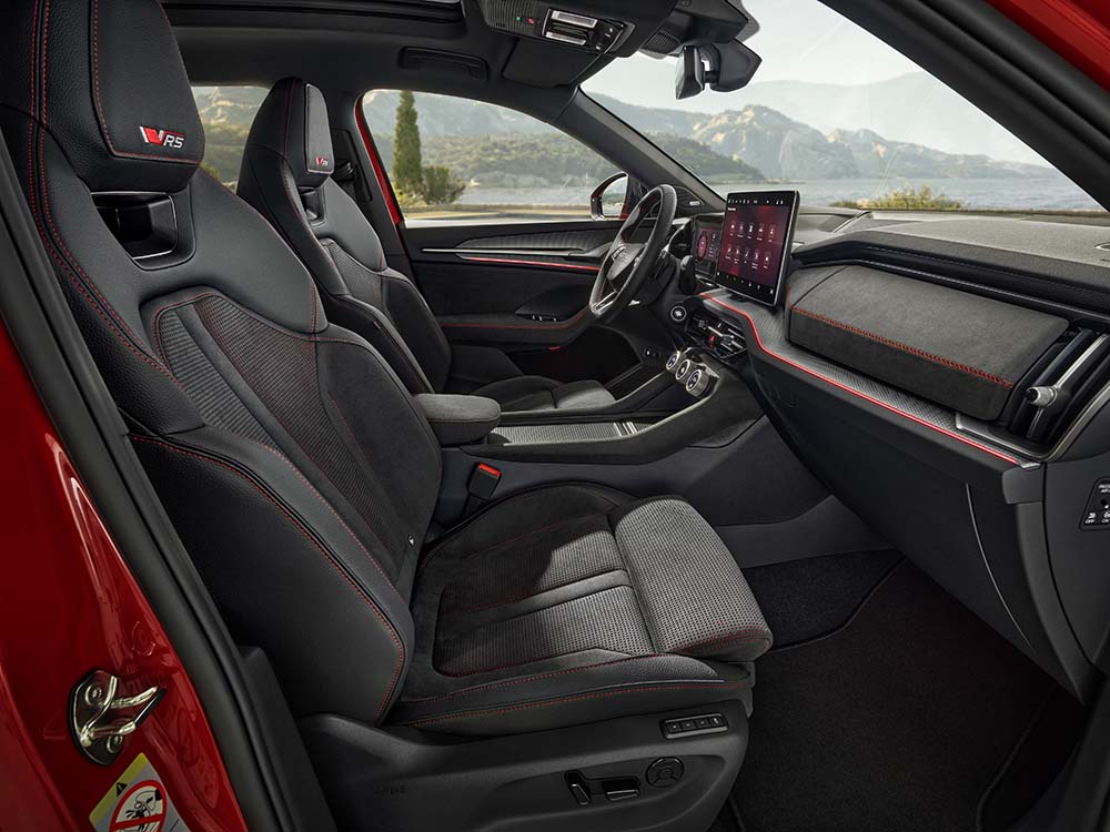 Za unutrašnjost su dostupne dve Design Selection opcije za Kodiaq RS. Početni RS Lounge Design Selection uključuje sportska sedišta s integrisanim naslonima za glavu i presvlake od crne Suedia/veštačke kože s crvenim kontrastnim šavovima.