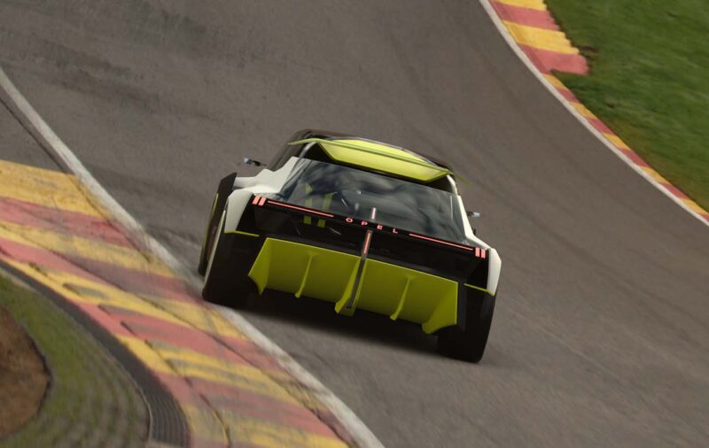 Zadnji deo donosi posebno čist i moderan izgled, sa osvetljenim Opel znakom i LED trakom preko cele širine. Unutrašnjost je futuristička – umesto klasičnih instrumenata, vozaču informacije prikazuje head-up displej i tkanine osvetljene iznutra, dok sedišta imaju nesvakidašnje rešenje – naslon i baza nisu spojeni, već su učvršćeni za pod i krov.