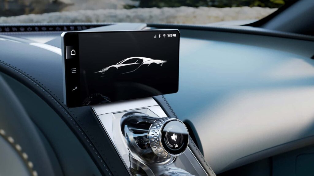 Tourbillon je takođe prvi Bugatti koji ima ekran za infotainment, Montiran je na mehanizam za sklapanje koji može promeniti orijentaciju ekrana u portretni ili pejzažni režim, u zavisnosti od upotrebe.