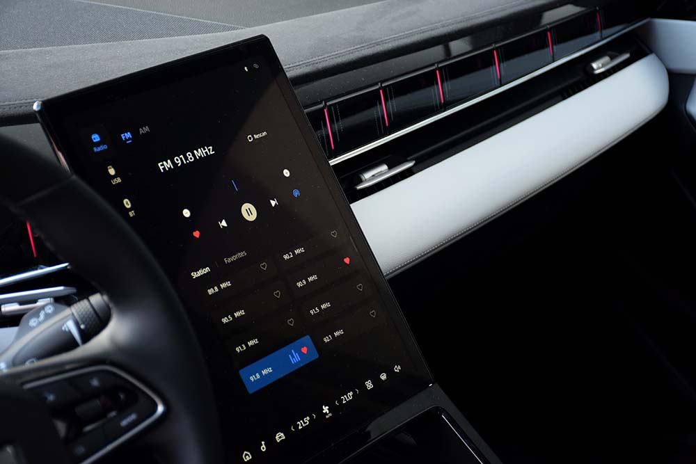 Centralnom konzolom dominira portretno orijentisani monitor. Ima dobar odziv, intuitivan je, ali neka rešenja su mogla biti bolje rešena, pogotovo kada se na raspolaganju već nalazi ekran koji zauzima pola kabine.