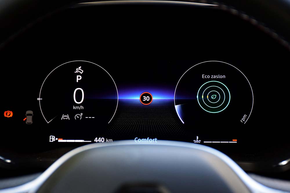 Iz nekog razloga vozač ostaje uskraćen za podatak o broju obrtaja. On može da se očita iz menija putnog računara, ali nema mnogo smisla da pored tolikog ekrana vozač mora da bira da li će pratiti potrošnju ili broj obrtaja. Pogotovo što je krug sa digitalnom kazaljkom tu, ali nema ispisane skale.