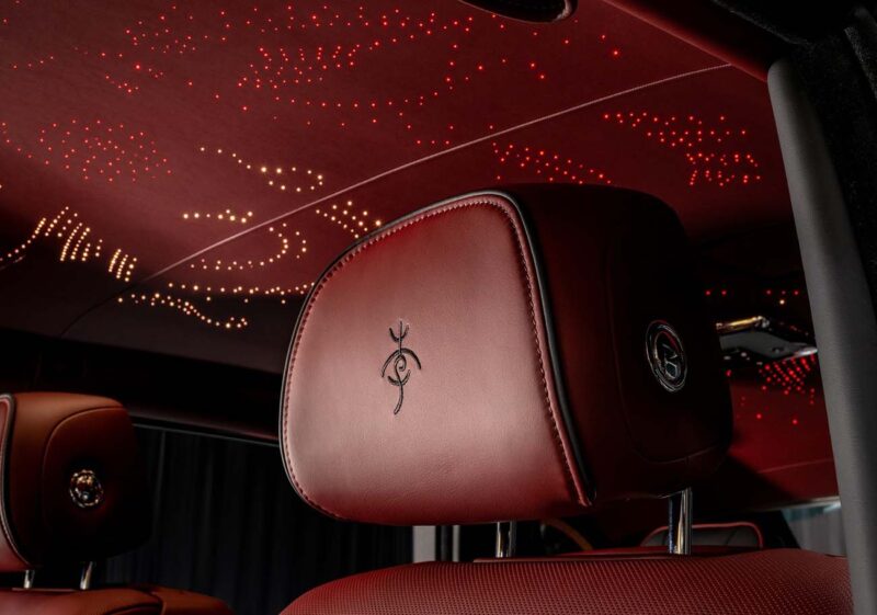 Ovo je dopunjeno crvenom i crnom kožom na prednjim i zadnjim Serenity sedištima sa funkcijom naginjanja, i završeno klijentovim porodičnim imenom na drevnom kineskom pismu, precizno izvezenim na naslonima za glavu kontrasnim pamučnim koncem.