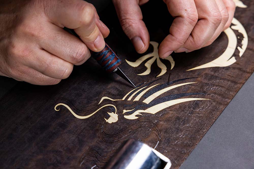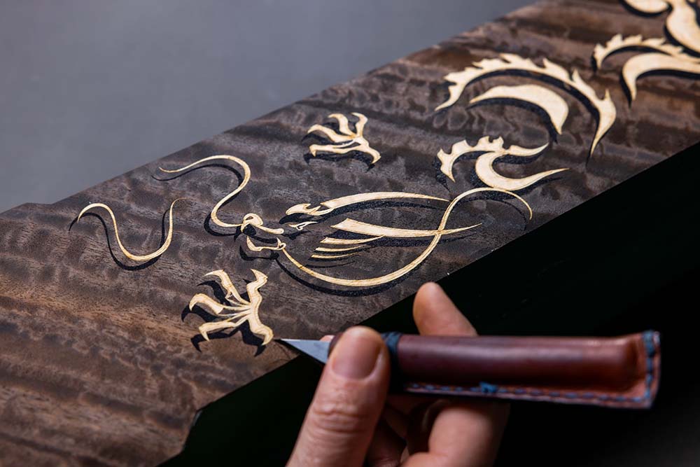 Crni Bolivar furnir dodaje dubinu, čineći da zmajevi izgledaju kao da lebde iznad površine.