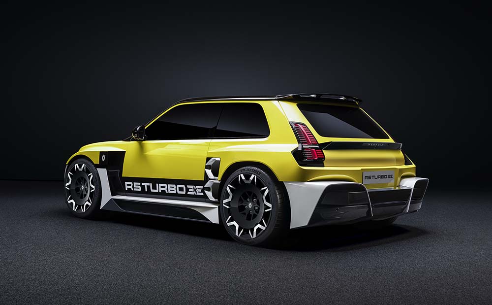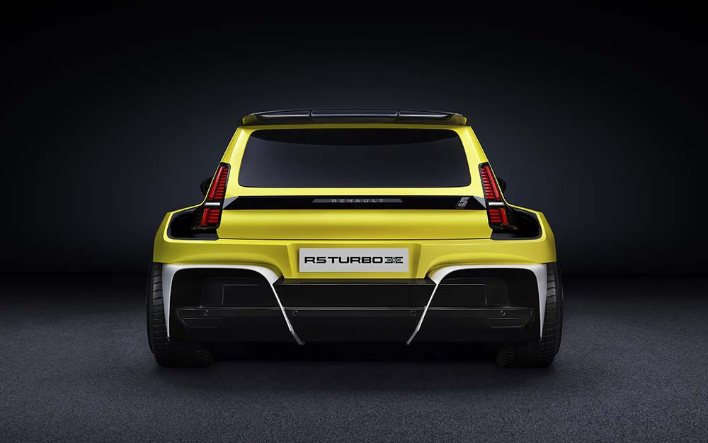 Hauba je agresivno izrezana, dok su ogromni prošireni lukovi blatobrana dizajnirani posebno za smeštanje novih velikih točkova i guma. Ekstravagantni dizajn se nastavlja duž bočnih pragova i zadnjeg branika, gde klasični oblik karoserije integriše zadnja svetla novog Renaulta 5 iz serijske proizvodnje.