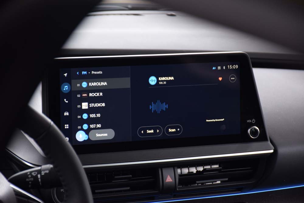 Mesto koje vozaču omogućava mnogo više poigravanja je veliki centralni displej. Pruža obilje funkcija, ali srećom ispod njega su zadržane standardne komande klimatizacije. Sa desne strane ekrana se našlo mesta i za klasičan rotacioni potenciometar ozvučenja. Pozicionran je tako da bude lako dostupan suvozaču, dok vozač ima praktične komande na upravljaču.